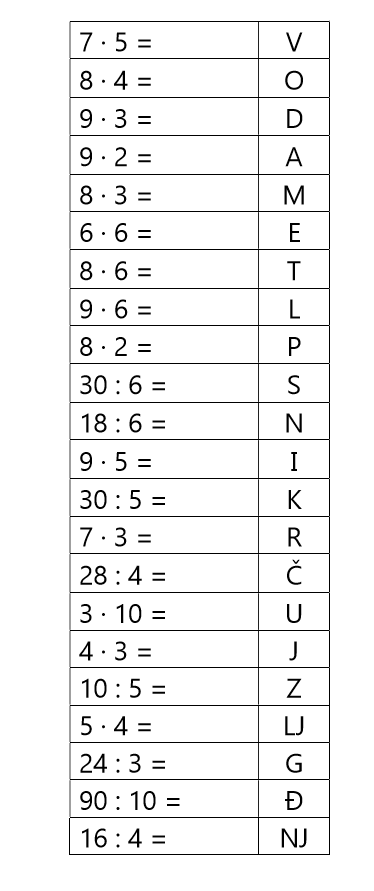Donja tablica krije jednu poruku. U bilježnicu napišite dobivenu poruku, ne trebate crtati tablicu, samo rješenje. Kako doći do rješenja? Pročitajte prvi broj u donjoj tablici (broj 7) sada pronađite taj rezultat (7) u gornjoj tablici. Ako ste točno računali pored broja 7 vam piše slovo Č. To znači da je početno slovo prve riječi slovo Č. Nastavite... sretno!